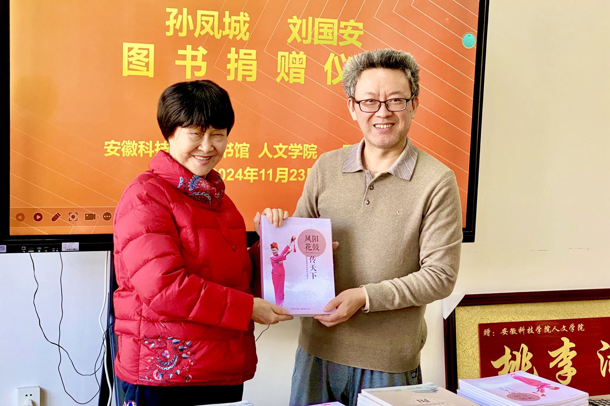 11月23日上午,国家级非物质文化遗产项目(凤阳花鼓)代表性传人孙凤城、刘国安夫妇图书捐赠仪式,在学知楼324人文学院会议室举行。猜球官方网站_猜球(中国)股份有限公司,客座教授——国家级非物质文化遗产项目(凤阳花鼓)代表性传承人孙凤城和凤阳电视台原副台长、安徽电视台特约记者、中国摄影家协会安徽分会会员刘国安,凤阳县文联主席陈友田,凤阳县教体局原副局长、凤阳年鉴主编张建人;人文学院院长、明文化研究会会长李晓东,图书馆馆长汪徐春、副馆长王玉林,人文学院中文系副主任、明文化研究会秘书长周广超参加相关活动。捐赠仪式由人文学院正处级组织员张严政主持。