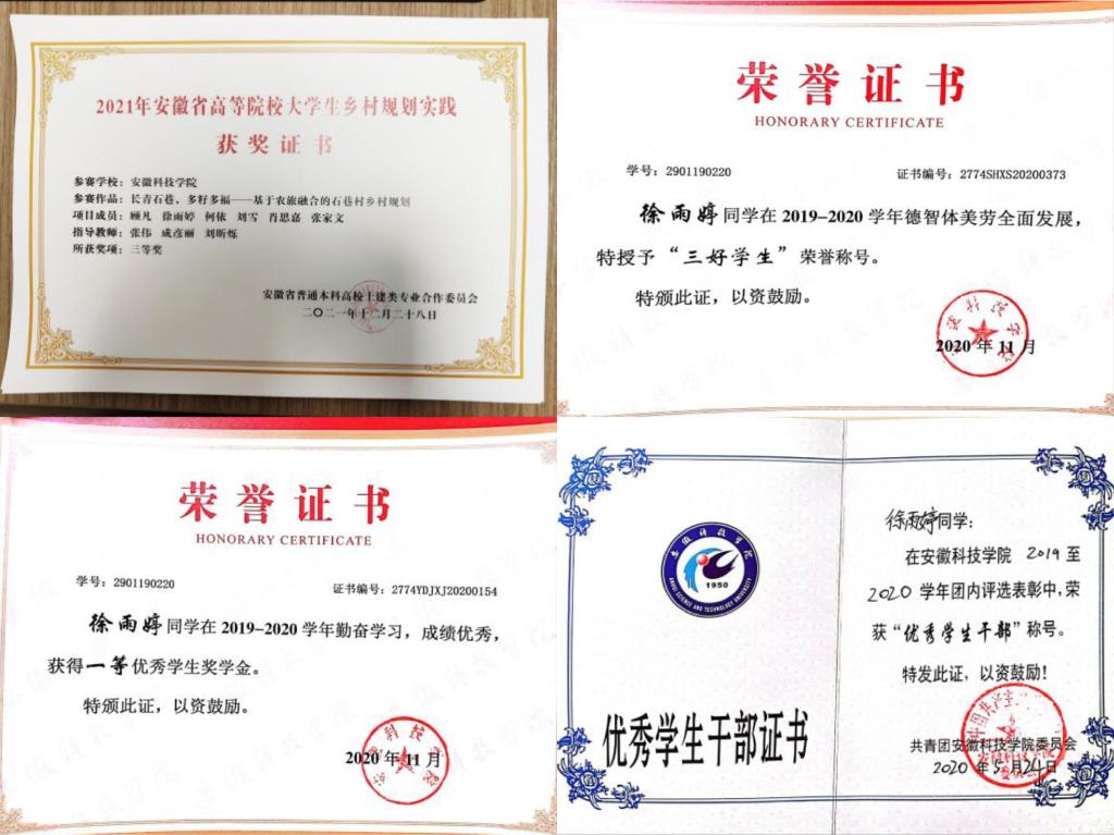 徐雨婷在学习上积极上进的同时也积极参加学校举办的各项活动。她共参与了两项省级大创项目、一项国家级大创项目。2021年参加了安徽省高等院校乡村规划大赛,并与所在的团队获得了三等奖。她清楚地知道自己的目标,并为之奋斗,付出实际行动,从而能取得满意的成绩。